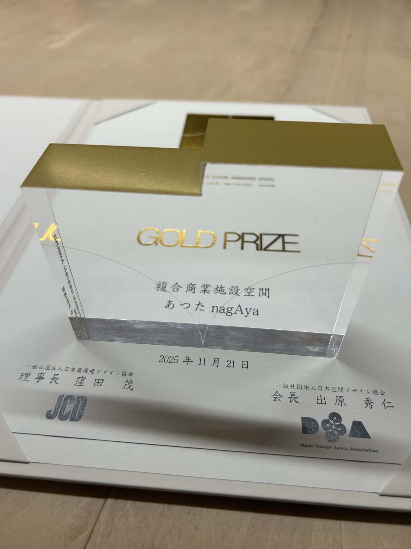日本空間デザイン賞2025 にて名鉄神宮前駅の「あつたnagAya」が金賞を受賞しました。12のカテゴリーがあり、複合施設空間部門での受賞です。