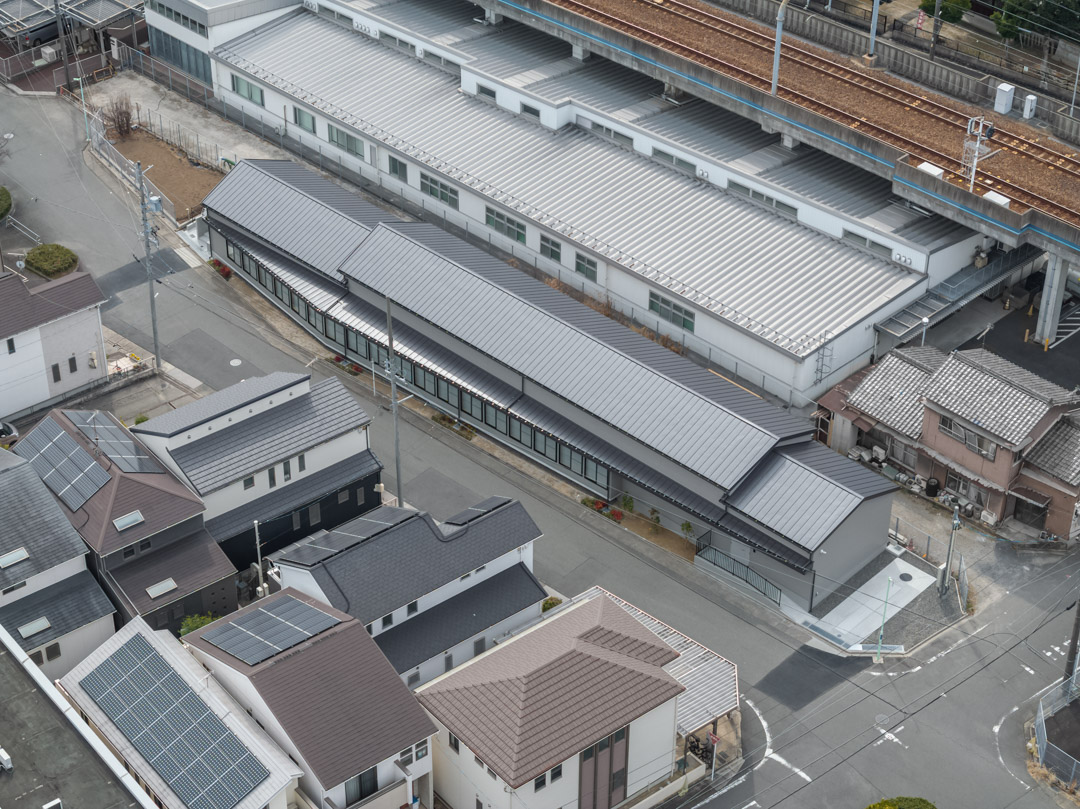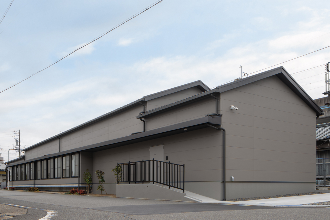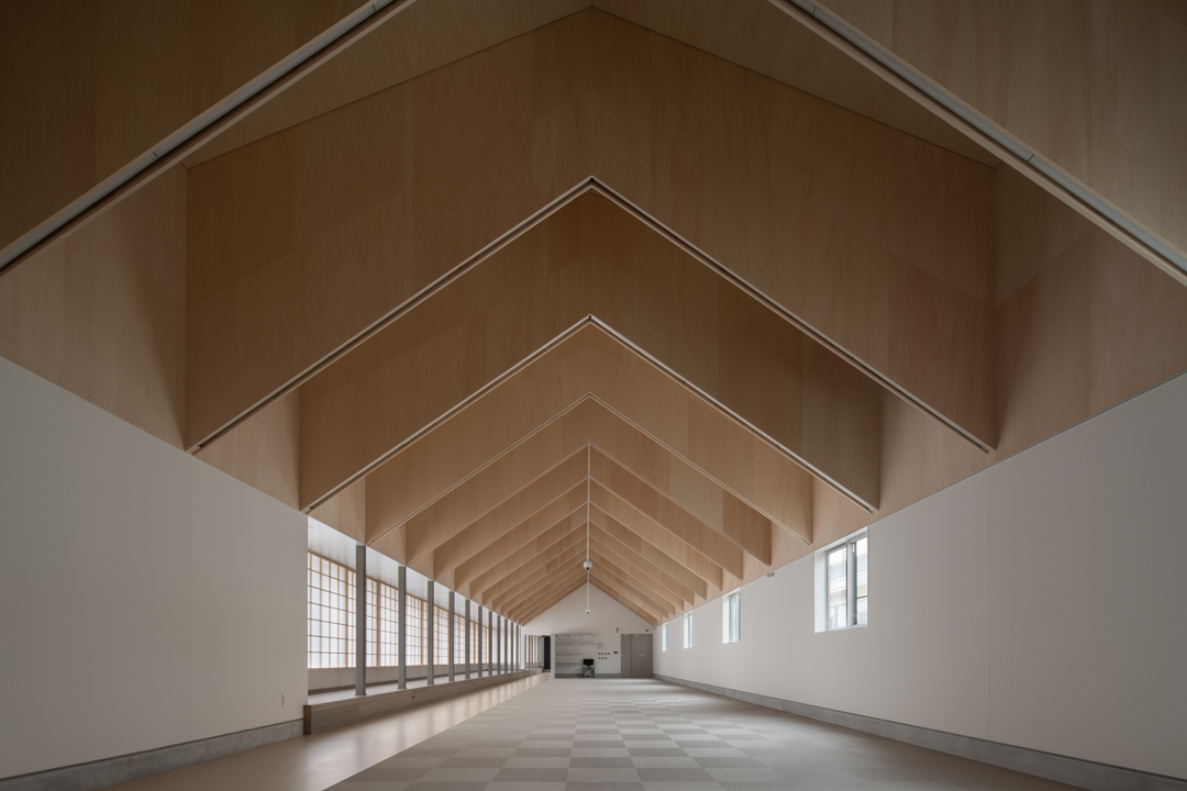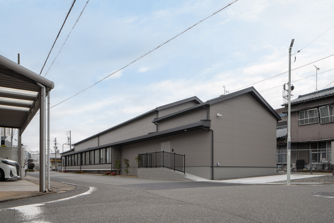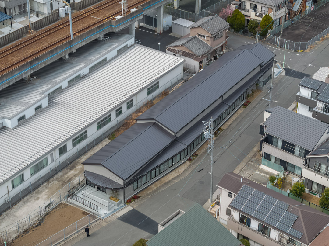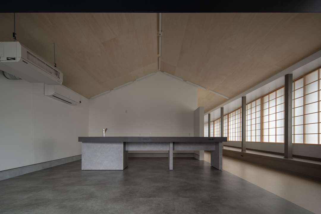 クライアントに求められた面積としては100坪であったが、建蔽率の余剰から30㎡ほどの余力があった。求められた100坪だけでは、執務エリアと倉庫、休憩室でいっぱいで、必要な機能だけを当てはめた場合、既存の建物と変わらず地域に対して完全に閉ざされた場所となることが予見されたため、用途の定まっていない、少し地域に開いた30㎡の小上がりを執務室と休憩室もまたがって付随させた。