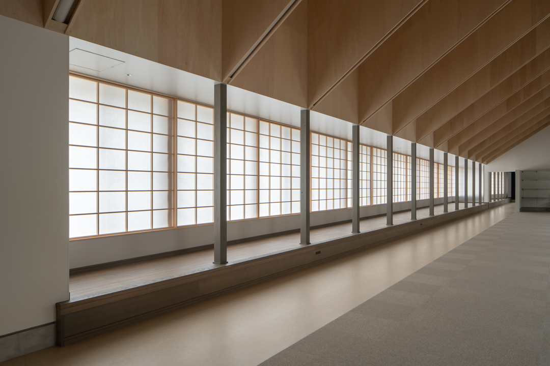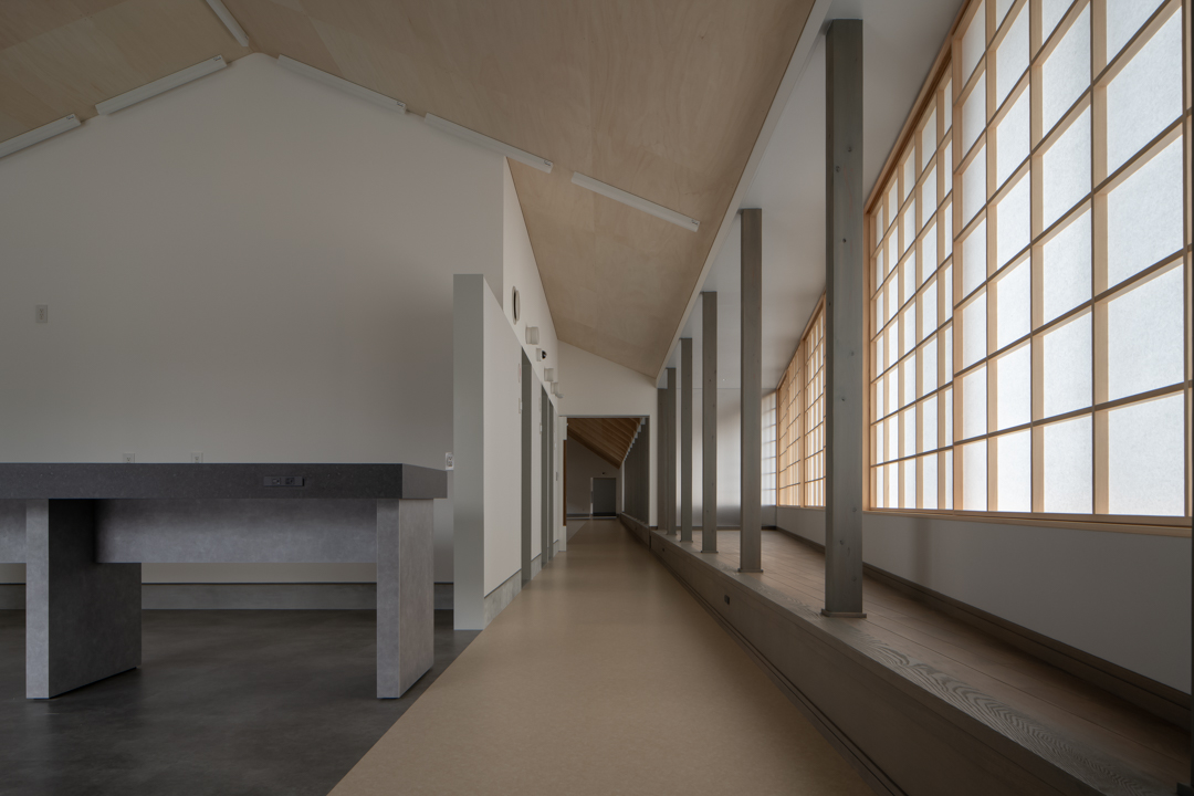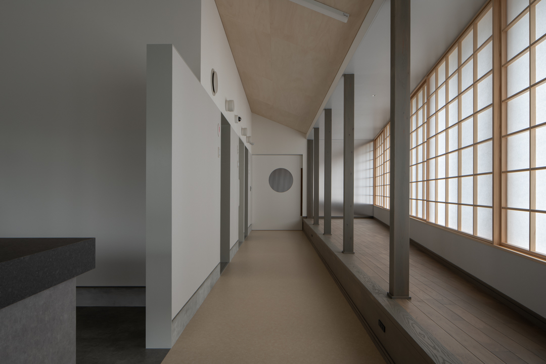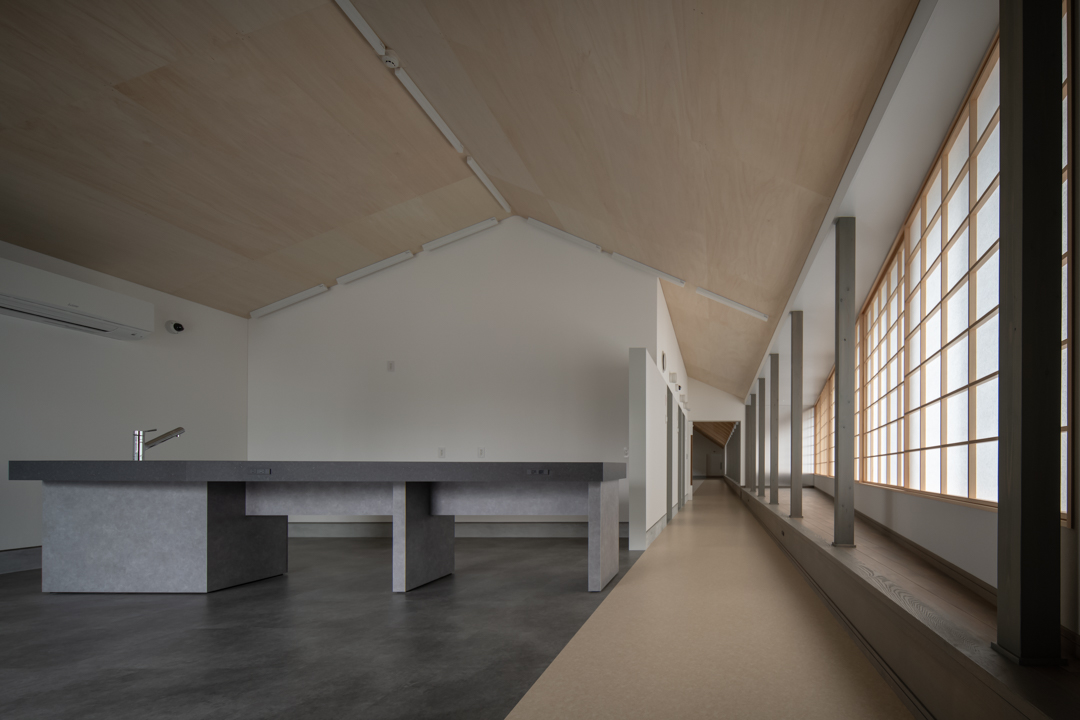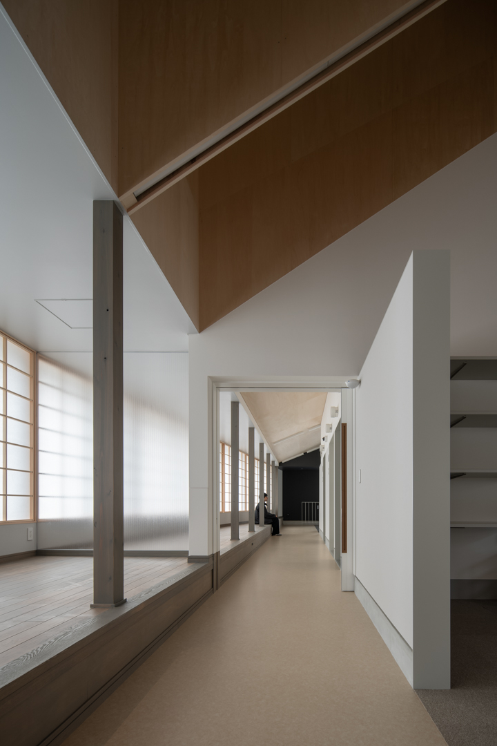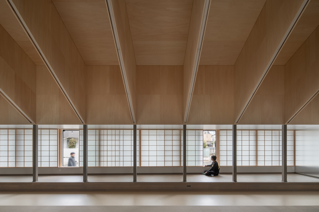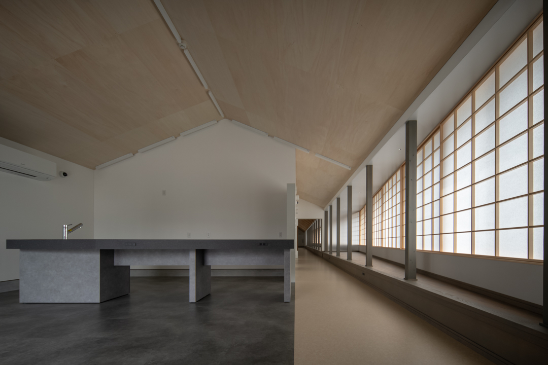 そしてこのバッファーゾーンは、このオフィスとまちの関係をつなぐものでもある。少し地面から浮かせ、高さを抑えることで軽やかさを演出し、さらに連窓を設けることで、少し様子がうかがえるようにし、まちに対する圧迫感を減少させた。書類管理という業務内容からも、あまりオフィスを開くことが望まれておらず、従来だと周囲の住人からすると少し不安感を醸し出してしまいがちだが、この小上がりの提案により、その不安感を払拭する計画とした。
