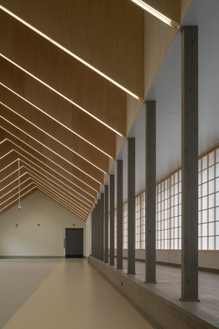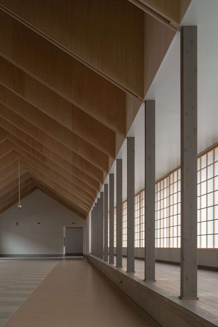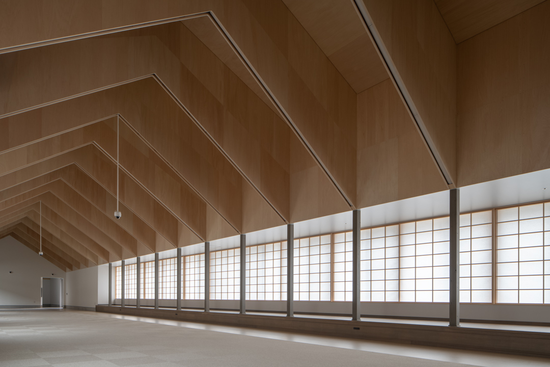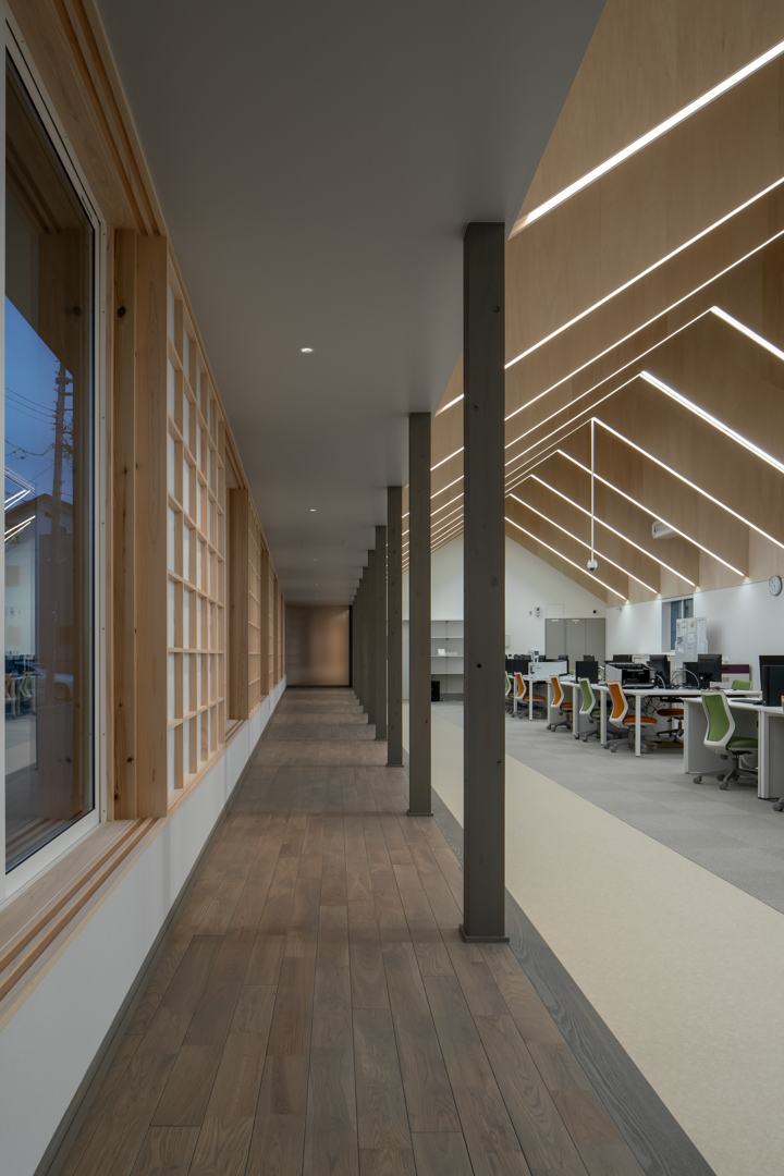 オフィスという用途がら執務エリアにはレイアウト変更が容易になることからも極力柱を落とさないことを望まれた。コストの制限もあることから木造の架構が必須となる中で、執務エリアを無柱空間とするため流通木材でトラスの架構を作り6m×40mの無柱空間を作り出している。